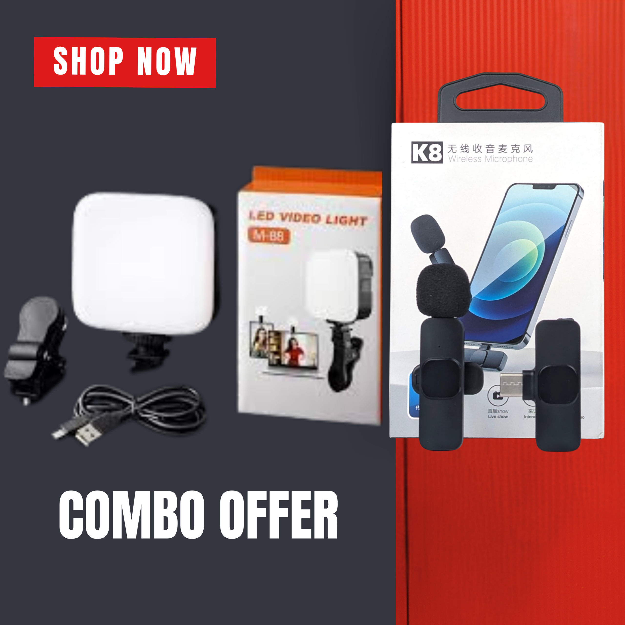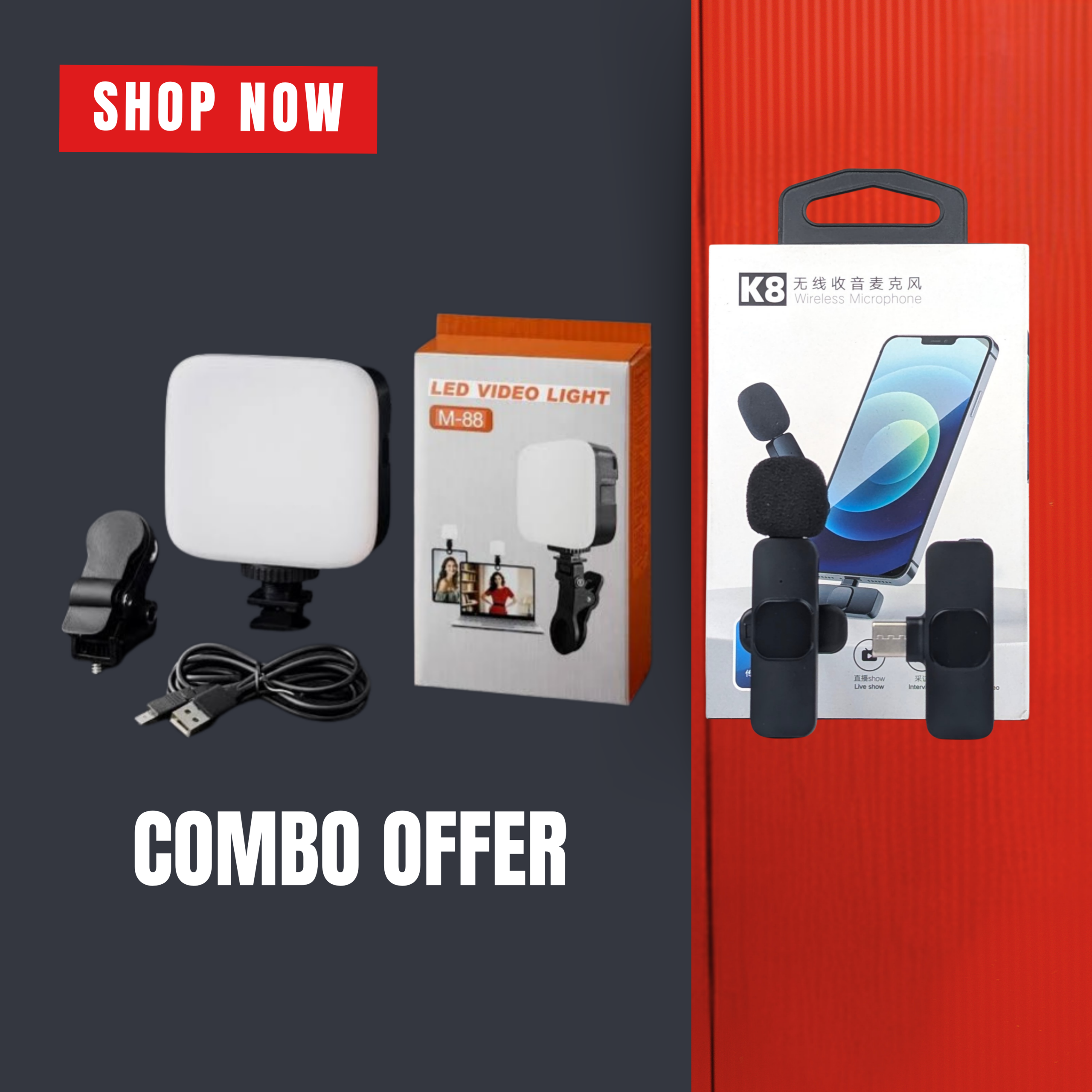 এই কারণেই আমরা নিয়ে এসেছি Content Creator Combo Offer — যেখানে একসাথে পাচ্ছেন K8 Wireless Microphone এবং M88 LED Video Light।